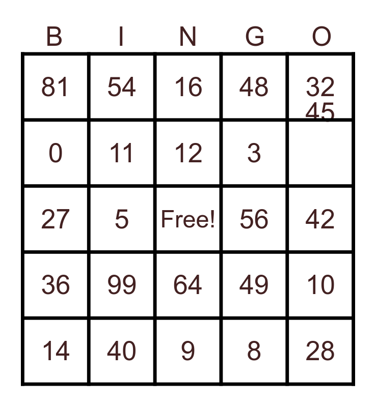 This bingo card has a free space and 44 words: 35, 28, 21, 14, 7, 8, 16, 24, 32, 40, 48, 56, 64, 99, 90, 9, 18, 27, 36, 45, 54, 63, 72, 81, 70, 42, 60, 50, 49, 36, 20, 10, 30, 6, 5, 15, 25, 4, 12, 0, 3, 2, 11 and 84.