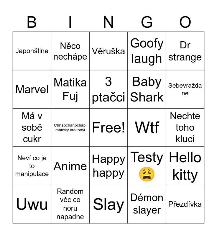 This bingo card has a free space and 24 words: Uwu, Anime, 3 ptačci, Démon slayer, Dr strange, Japonština, Něco nechápe, Věruška, Wtf, Nechte toho kluci, Má v sobě cukr, Matika Fuj, Testy 😩, Hello kitty, Marvel, Random věc co noru napadne, Slay, Goofy laugh, Sebevražda ne, Neví co je to manipulace, Chnapchanpchapi maličký krokodýl, Happy happy, Baby Shark and Přezdívka.