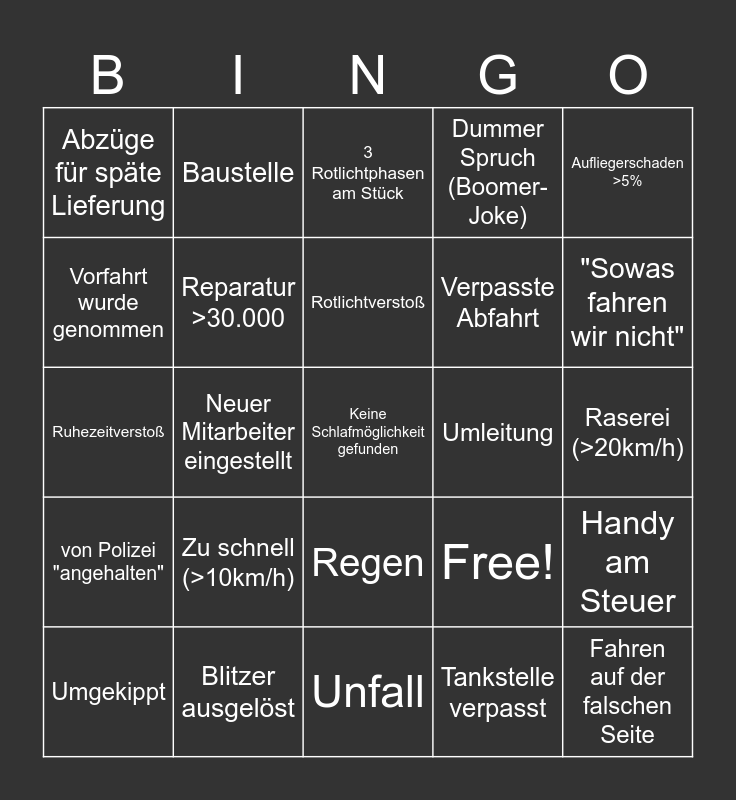 This bingo card has 25 words: Zu schnell (>10km/h), Unfall, Rotlichtverstoß, Umgekippt, Aufliegerschaden >5%, Abzüge für späte Lieferung, Vorfahrt wurde genommen, Baustelle, Umleitung, Regen, Verpasste Abfahrt, Ruhezeitverstoß, Free!, Handy am Steuer, Reparatur >30.000, Fahren auf der falschen Seite, Raserei (>20km/h), 3 Rotlichtphasen am Stück, "Sowas fahren wir nicht", Neuer Mitarbeiter eingestellt, Keine Schlafmöglichkeit gefunden, Blitzer ausgelöst, von Polizei "angehalten", Dummer Spruch (Boomer-Joke) and Tankstelle verpasst.