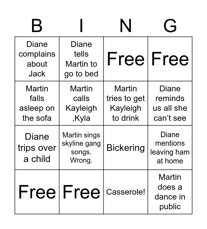 This bingo card has 16 words: Free, Free, Free, Free, Martin falls asleep on the sofa, Diane tells Martin to go to bed, Bickering, Diane mentions leaving ham at home, Diane complains about Jack, Martin calls Kayleigh ,Kyla, Casserole!, Diane reminds us all she can’t see, Diane trips over a child, Martin sings skyline gang songs. Wrong., Martin tries to get Kayleigh to drink and Martin does a dance in public.