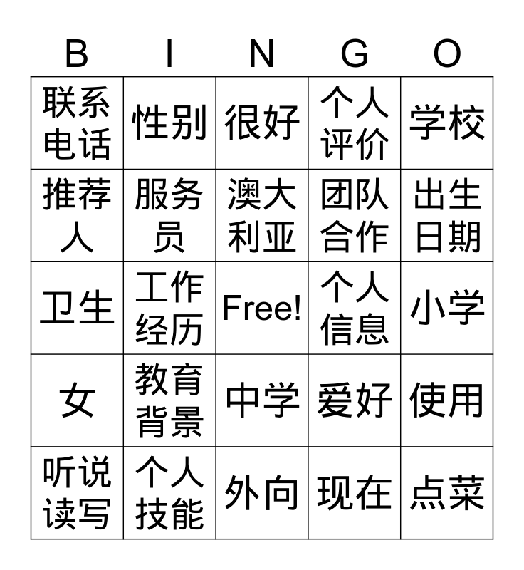 This bingo card has a free space and 24 words: 教育背景, 个人技能, 澳大利亚, 听说读写, 学校, 联系电话, 推荐人, 性别, 个人信息, 中学, 团队合作, 卫生, 爱好, 使用, 服务员, 现在, 小学, 很好, 出生日期, 工作经历, 点菜, 女, 个人评价 and 外向.