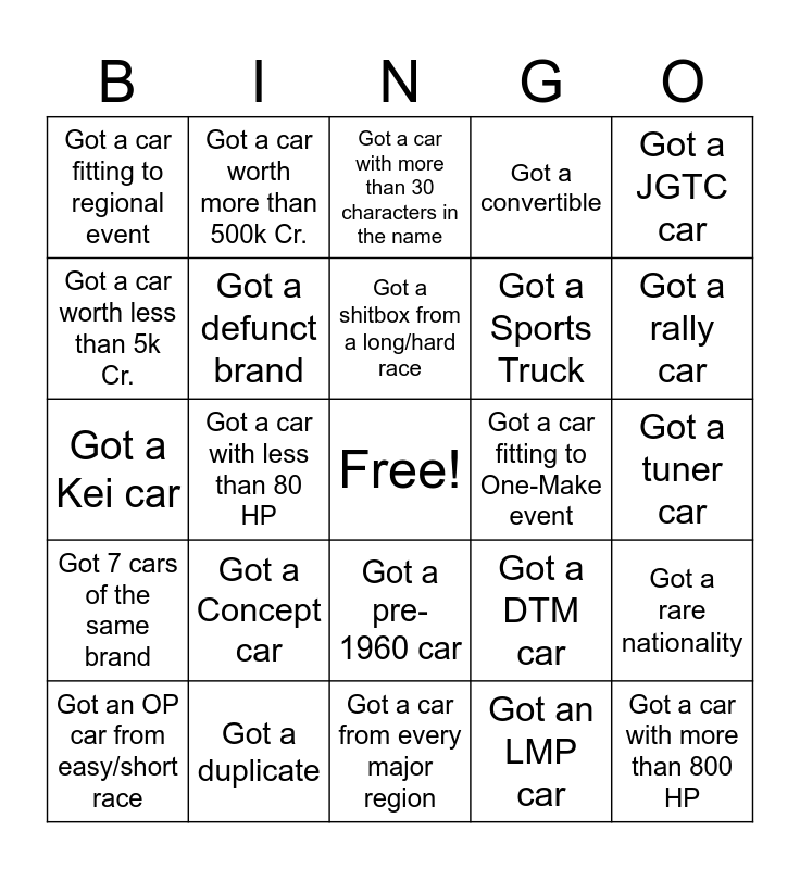 This bingo card has a free space and 24 words: Got a Concept car, Got a duplicate, Got a shitbox from a long/hard race, Got an OP car from easy/short race, Got a JGTC car, Got a car fitting to regional event, Got a car worth less than 5k Cr., Got a car worth more than 500k Cr., Got a car fitting to One-Make event, Got a pre-1960 car, Got a Sports Truck, Got a Kei car, Got a DTM car, Got a rare nationality, Got a defunct brand, Got an LMP car, Got a tuner car, Got a car with more than 30 characters in the name, Got a rally car, Got a car with less than 80 HP, Got a car with more than 800 HP, Got 7 cars of the same brand, Got a convertible and Got a car from every major region.