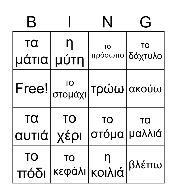 This bingo card has 16 words: το κεφάλι, τα μαλλιά, το πρόσωπο, τα μάτια, τα αυτιά, η μύτη, το στόμα, η κοιλιά, Free!, το στομάχι, το πόδι, το δάχτυλο, το χέρι, ακούω, τρώω and βλέπω.