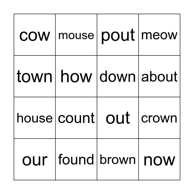This bingo card has 20 words: crown, frown, pout, wow, our, town, found, cow, house, mouse, count, out, how, now, down, shout, about, meow, brown and round.