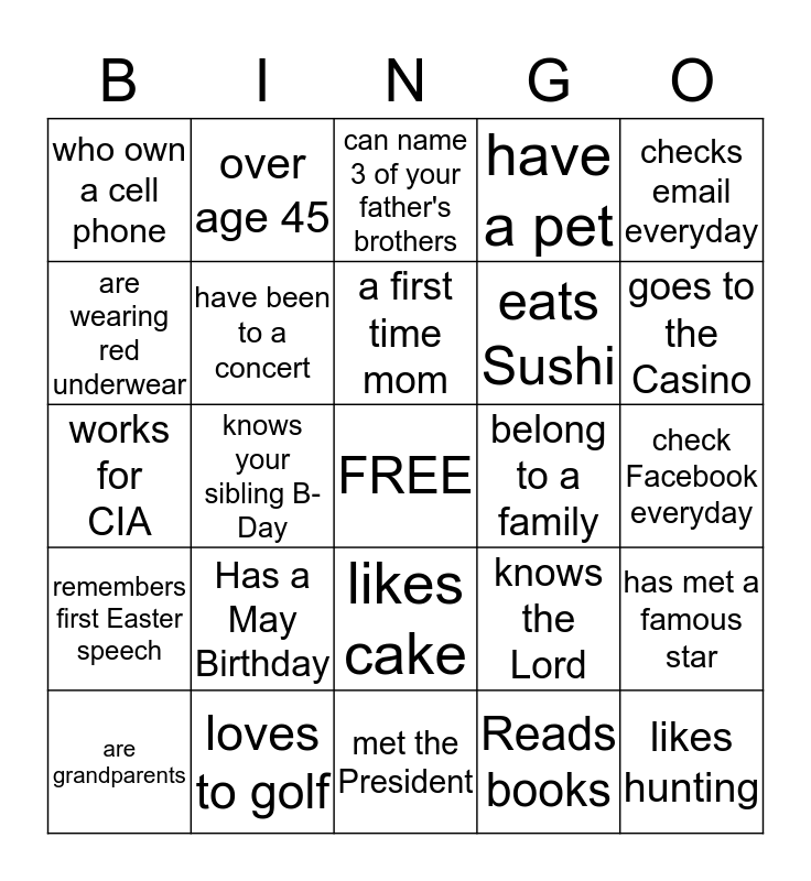 This bingo card has a free space and 24 words: Has a May Birthday, loves to golf, a first time mom, are grandparents, checks email everyday, who own a cell phone, are wearing red underwear, over age 45, belong to a family, likes cake, eats Sushi, works for CIA, knows the Lord, has met a famous star, have been to a concert, Reads books, check Facebook everyday, can name 3 of your father's brothers, goes to the Casino, knows your sibling B-Day, likes hunting, remembers first Easter speech, have a pet and met the President.