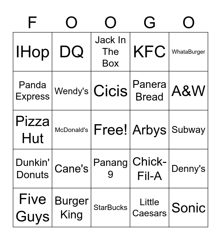 This bingo card has a free space and 24 words: Five Guys, Cane's, Cicis, Little Caesars, WhataBurger, IHop, DQ, Jack In The Box, Arbys, Subway, Pizza Hut, Wendy's, Chick-Fil-A, Denny's, Panda Express, Burger King, StarBucks, KFC, A&W, Dunkin' Donuts, McDonald's, Panang 9, Panera Bread and Sonic.