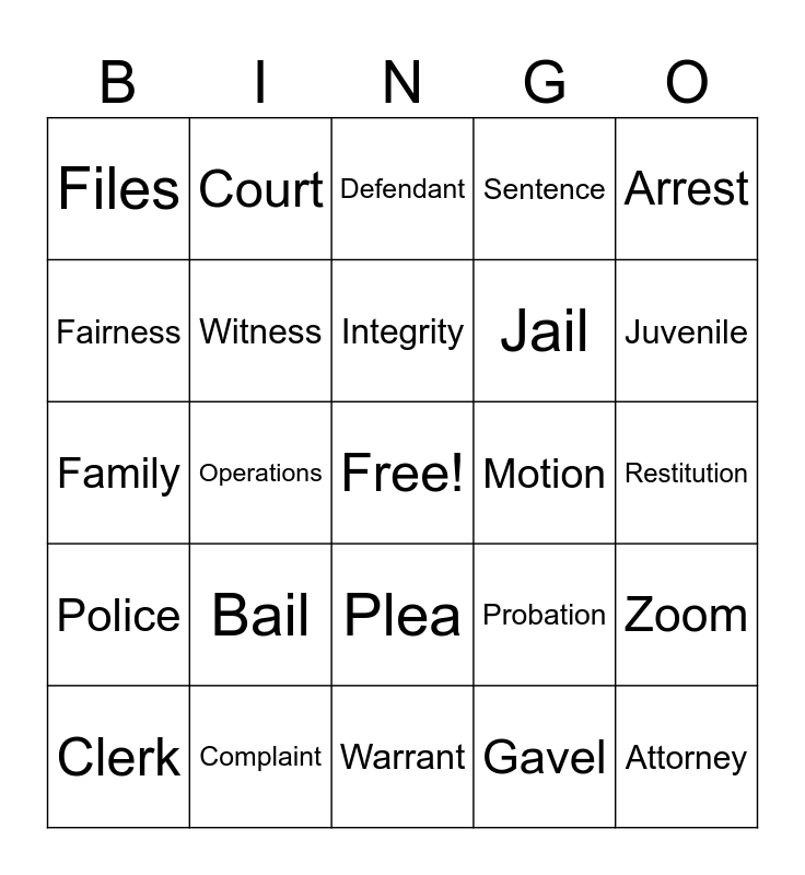This bingo card has a free space and 43 words: Prosecutor, Attorney, Judge, Clerk, Bench, Gavel, Defendant, Plaintiff, Arrest, Complaint, Sentence, Motion, Plea, Bail, Jury, Warrant, Sheriff, Family, Settlement, Juvenile, Court, Lawsuit, Sue, Files, Fines, Restitution, Judiciary, Prison, Probation, Police, Criminal, Zoom, Teams, Operations, Justice, Public, Independence, Integrity, Fairness, Jail, Civil, Witness and Trial.
