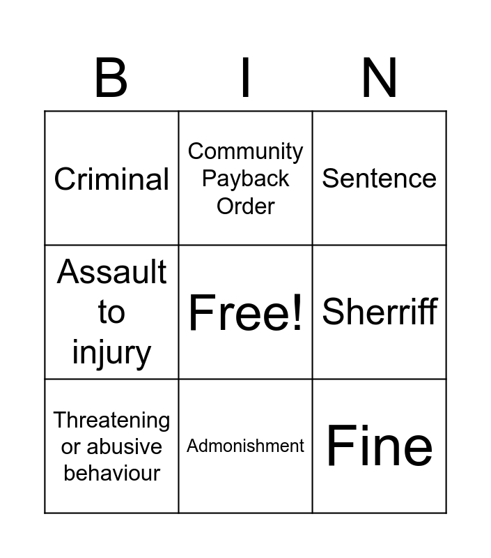 This bingo card has a free space and 12 words: Prison, Reoffender, Fine, Sherriff, Community Payback Order, Sentence, Admonishment, High court, Criminal, Assault to injury, Threatening or abusive behaviour and Electronic tagging.