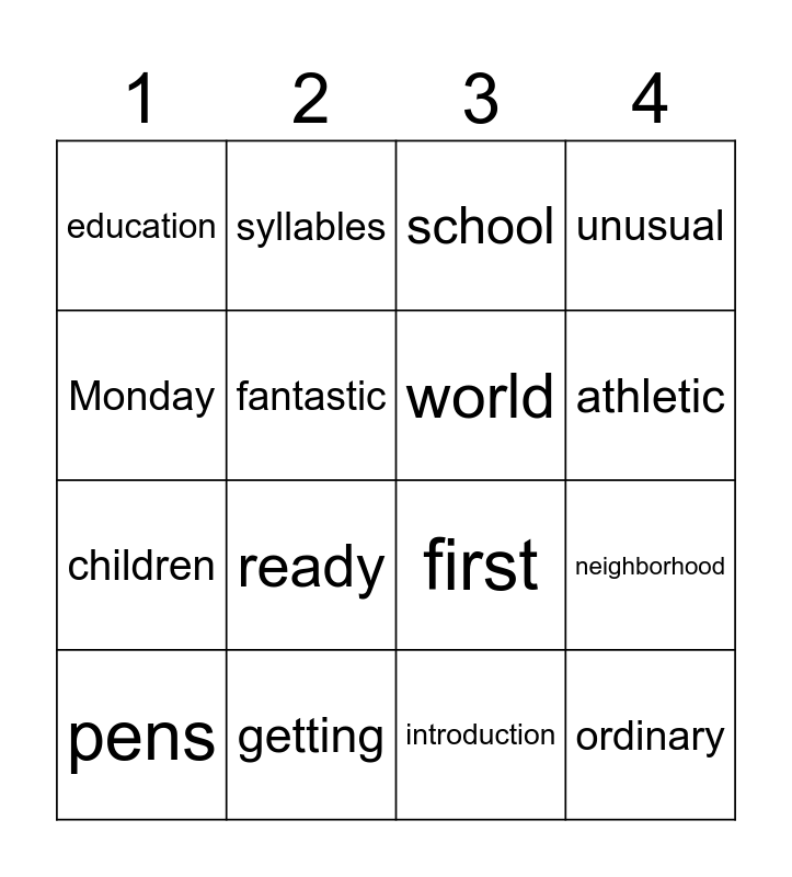 This bingo card has 16 words: getting, neighborhood, school, education, children, syllables, first, introduction, Monday, fantastic, pens, unusual, ready, athletic, world and ordinary.
