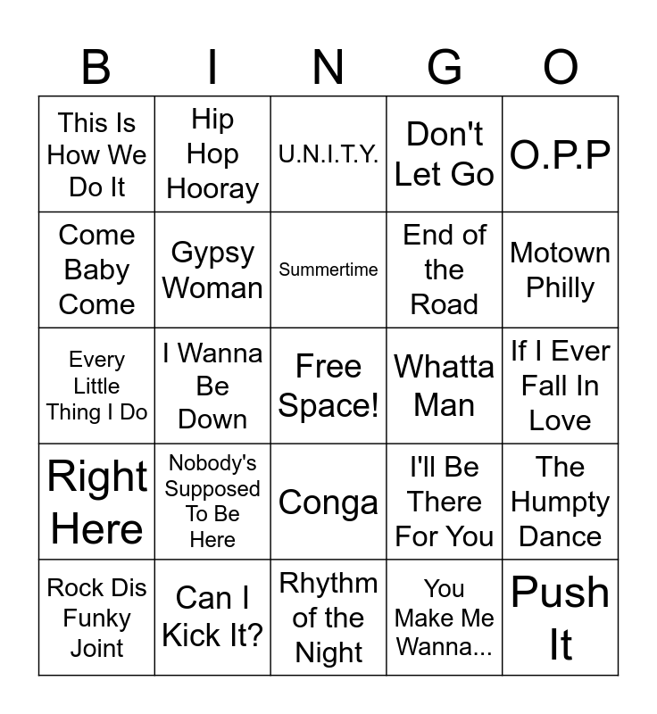 This bingo card has a free space and 60 words: Gangsta's Paradise, Can I Kick It?, People Everyday, Right Here, You Make Me Wanna..., Men In Black, Gypsy Woman, Groove Is In The Heart, End of the Road, I'll Be Missing You, Don't Let Go, Good Vibrations, Come Baby Come, 1-2-3-4 (Sumpin' New), C'mon N Ride It, This Is How We Do It, Push It, O.P.P, Still Not A Player, Summertime, Whatta Man, U.N.I.T.Y., Rock Dis Funky Joint, The Humpty Dance, I Wish, Return of the Mack, Jump Around, Poison, Motown Philly, Real Love, What You Want, Candy Rain, I Love Your Smile, Feels good, Hip Hop Hooray, Tell Me, Love Like This, I Wanna Be Down, So Into You, Every Little Thing I Do, Hey Mr. DJ, Nobody's Supposed To Be Here, If I Ever Fall In Love, I Get Lonely, I'll Be There For You, They Don't Know, Soon as I Get Home, I'm Goin' Down, Don't Walk Away, Conga, Rhythm of the Night, Too Close, Pony, Feel Me Now, Insane in the Brain, Ruff Ryders Anthem, Got Your Money, Crush On You, What's Up Doc? (Can We Rock?) and Just A Friend.
