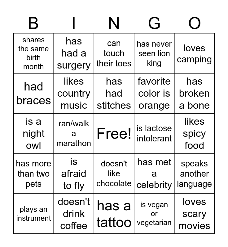 This bingo card has a free space and 24 words: is afraid to fly, doesn't drink coffee, has had stitches, plays an instrument, loves camping, shares the same birth month, had braces, has had a surgery, is lactose intolerant, doesn't like chocolate, favorite color is orange, is a night owl, has met a celebrity, speaks another language, likes country music, is vegan or vegetarian, likes spicy food, can touch their toes, has broken a bone, ran/walk a marathon, loves scary movies, has more than two pets, has never seen lion king and has a tattoo.