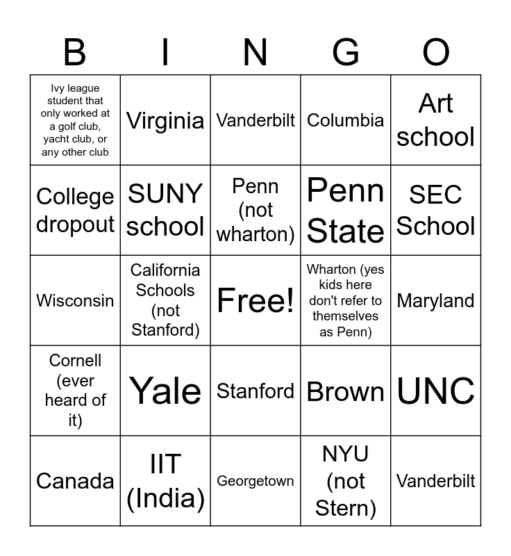 This bingo card has a free space and 34 words: Princeton, NYU (not Stern), NYU Stern, UChicago, Cornell (ever heard of it), SUNY school, Art school, Canada, Virginia, Baruch, Penn (not wharton), Vanderbilt, Michigan, Harvard, Wharton (yes kids here don't refer to themselves as Penn), SEC School, IIT (India), Wisconsin, Yale, Brown, Stanford, Duke, Ivy league student that only worked at a golf club, yacht club, or any other club, Maryland, Georgetown, Vanderbilt, Columbia, Rutgers (yes this school exists), Penn State, College dropout, Stanford, California Schools (not Stanford), UNC and Northwestern.