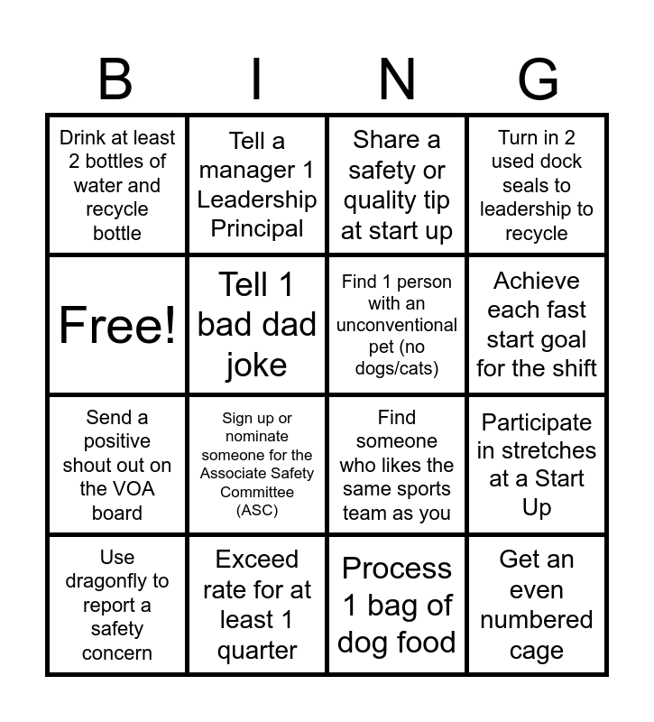 This bingo card has 16 words: Exceed rate for at least 1 quarter, Participate in stretches at a Start Up, Share a safety or quality tip at start up, Drink at least 2 bottles of water and recycle bottle, Send a positive shout out on the VOA board, Tell a manager 1 Leadership Principal, Find someone who likes the same sports team as you, Process 1 bag of dog food, Free!, Tell 1 bad dad joke, Use dragonfly to report a safety concern, Turn in 2 used dock seals to leadership to recycle, Sign up or nominate someone for the Associate Safety Committee (ASC), Achieve each fast start goal for the shift, Find 1 person with an unconventional pet (no dogs/cats) and Get an even numbered cage.