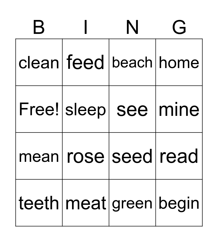 This bingo card has 16 words: meat, read, beach, clean, mean, feed, seed, green, Free!, sleep, teeth, home, rose, mine, see and begin.