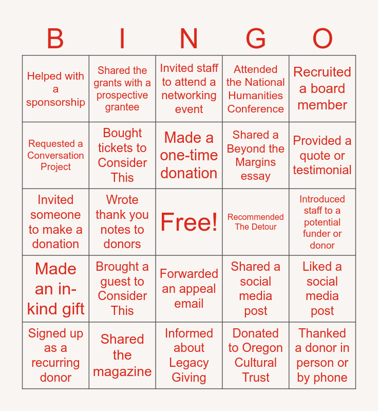 This bingo card has a free space and 24 words: Brought a guest to Consider This, Shared the magazine, Made a one-time donation, Signed up as a recurring donor, Recruited a board member, Helped with a sponsorship, Requested a Conversation Project, Shared the grants with a prospective grantee, Recommended The Detour, Forwarded an appeal email, Shared a Beyond the Margins essay, Invited someone to make a donation, Shared a social media post, Liked a social media post, Bought tickets to Consider This, Donated to Oregon Cultural Trust, Introduced staff to a potential funder or donor, Invited staff to attend a networking event, Provided a quote or testimonial, Wrote thank you notes to donors, Thanked a donor in person or by phone, Made an in-kind gift, Attended the National Humanities Conference and Informed about Legacy Giving.