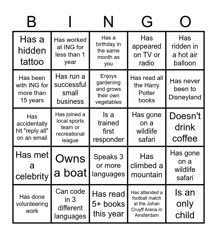 This bingo card has 35 words: Has completed a marathon, Has a collection of vinyl records, Has traveled to all 7 continents, Has run a successful small business, Speaks 3 or more languages, Has appeared on TV or radio, Has been with ING for more than 15 years, Can play a musical instrument, Enjoys gardening and grows their own vegetables, Has recently been promoted, Has accidentally hit "reply all" on an email, Has ridden in a hot air balloon, Has 0 unread emails, Has ridden a camel in the desert, Has a hidden tattoo, Has gone on a wildlife safari, Has attended a football match at the Johan Cruyff Arena in Amsterdam, Has joined a local sports team or recreational league, Has met a celebrity, Is a trained first responder, Has climbed a mountain, Has done volunteering work, Has gone on a wildlife safari, Can code in 3 different languages, Has a birthday in the same month as you, Has never been to Disneyland, Is an only child, Can quote PI to at least 5 decimal places, Has read all the Harry Potter books, Doesn't drink coffee, Has a twin, Has read 5+ books this year, Owns a boat, Has worked at ING for less than 1 year and Is going on vacation soon.