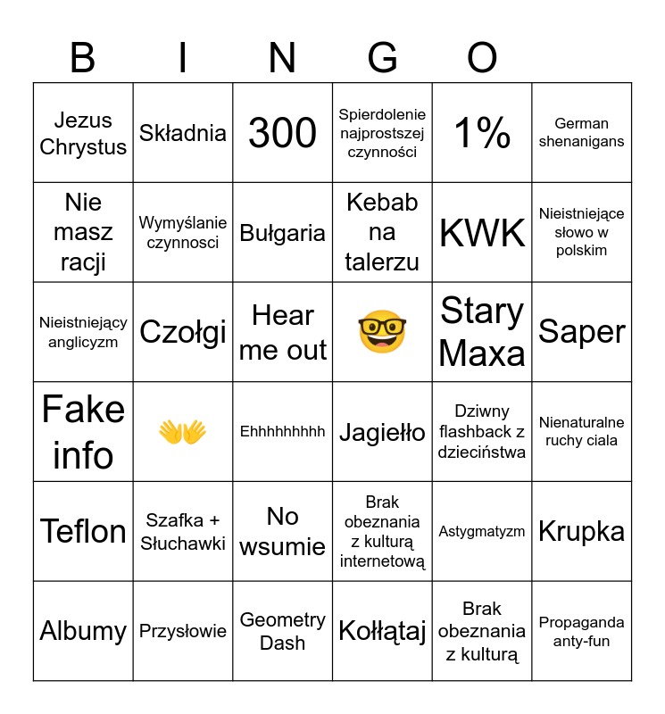 This bingo card has 36 words: Brak obeznania z kulturą internetową, No wsumie, Kołłątaj, Nie masz racji, Fake info, 🤓, Wymyślanie czynnosci, Geometry Dash, 1%, Astygmatyzm, Nieistniejące słowo w polskim, Spierdolenie najprostszej czynności, Krupka, Czołgi, Kebab na talerzu, Jezus Chrystus, Teflon, Stary Maxa, Nieistniejący anglicyzm, 300, Hear me out, 👐, Jagiełło, Ehhhhhhhhh, Dziwny flashback z dzieciństwa, Składnia, KWK, Przysłowie, Bułgaria, German shenanigans, Propaganda anty-fun, Albumy, Nienaturalne ruchy ciala, Saper, Szafka + Słuchawki and Brak obeznania z kulturą.
