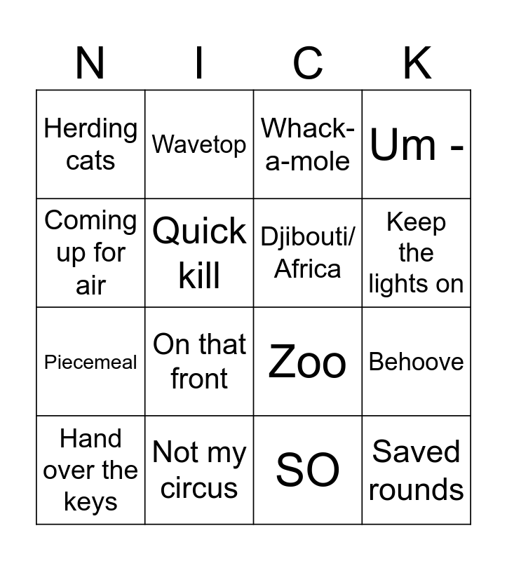 This bingo card has 16 words: Not my circus, Behoove, Whack-a-mole, Herding cats, Piecemeal, Wavetop, Zoo, SO, Coming up for air, Quick kill, Hand over the keys, Um -, On that front, Keep the lights on, Djibouti/ Africa and Saved rounds.