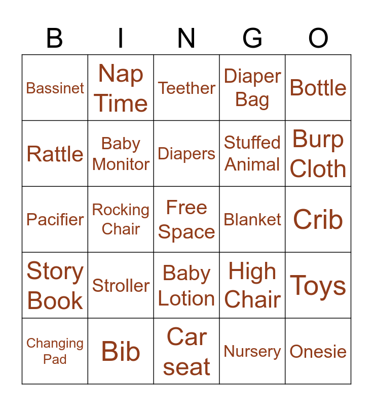 This bingo card has a free space and 24 words: Stroller, Bib, Diapers, Changing Pad, Bottle, Bassinet, Rattle, Nap Time, Blanket, Baby Lotion, Stuffed Animal, Pacifier, High Chair, Toys, Baby Monitor, Nursery, Crib, Teether, Burp Cloth, Rocking Chair, Onesie, Story Book, Diaper Bag and Car seat.