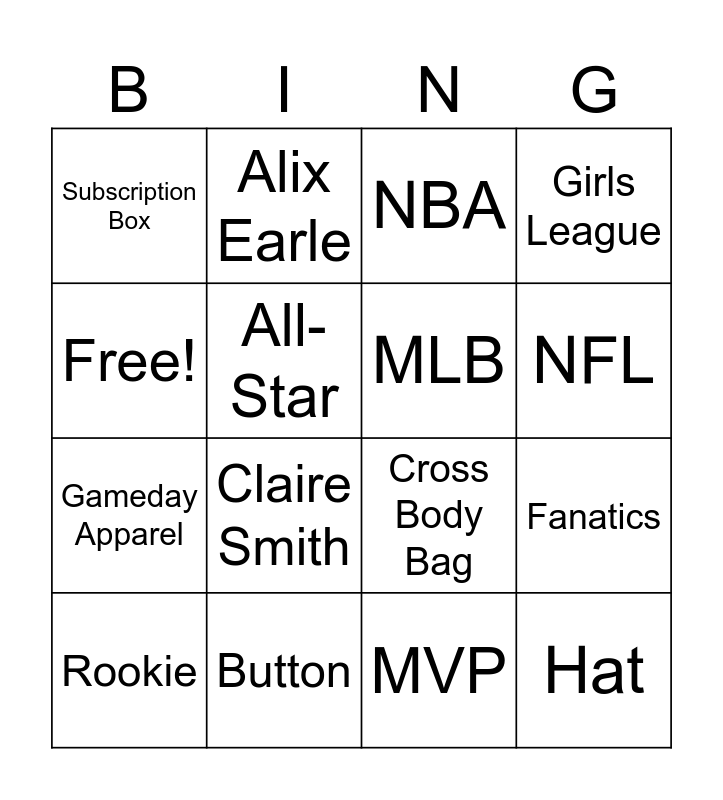 This bingo card has 16 words: Button, Fanatics, NBA, Subscription Box, Gameday Apparel, Alix Earle, Cross Body Bag, MVP, Free!, All-Star, Rookie, Girls League, Claire Smith, NFL, MLB and Hat.