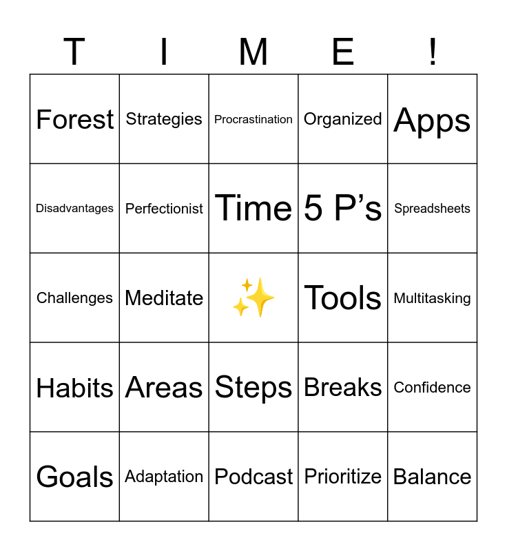 This bingo card has a free space and 24 words: Areas, Adaptation, Time, Goals, Apps, Forest, Disadvantages, Strategies, Tools, Steps, 5 P’s, Challenges, Breaks, Confidence, Perfectionist, Prioritize, Multitasking, Procrastination, Spreadsheets, Meditate, Balance, Habits, Organized and Podcast.