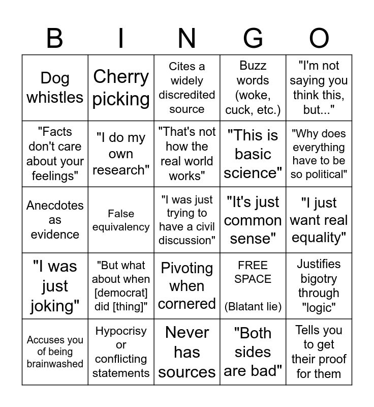 This bingo card has 25 words: "But what about when [democrat] did [thing]", Never has sources, "That's not how the real world works", Accuses you of being brainwashed, "I'm not saying you think this, but...", Dog whistles, "Facts don't care about your feelings", Cherry picking, "It's just common sense", Pivoting when cornered, "This is basic science", Anecdotes as evidence, FREE SPACE (Blatant lie), Justifies bigotry through "logic", "I do my own research", Tells you to get their proof for them, "I just want real equality", Cites a widely discredited source, "Why does everything have to be so political", False equivalency, "I was just trying to have a civil discussion", Hypocrisy or conflicting statements, "I was just joking", Buzz words (woke, cuck, etc.) and "Both sides are bad".