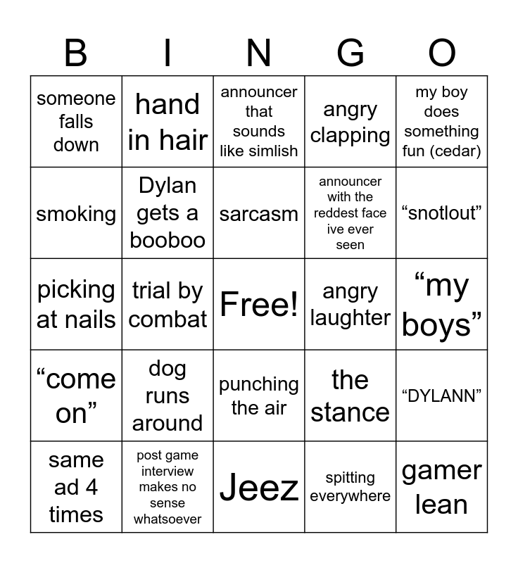 This bingo card has a free space and 36 words: Face grab, nose pinching, yells at Dylan, Dylan gets a booboo, the stance, “come on”, sarcasm, “no no”, my boy does something fun (cedar), nose commentary, trial by combat, angry clapping, jazz hands, angry laughter, “snotlout”, someone falls down, octopus, dog runs around, gamer lean, announcer that sounds like simlish, “my boys”, “DYLANN”, post game interview makes no sense whatsoever, same ad 4 times, Jeez, hand in hair, picking at nails, leg tapping, announcer with the reddest face ive ever seen, smoking, mad at alex, time discussion, spitting everywhere, punching the air, dogpiling and we get to see someone in the audience wasted.