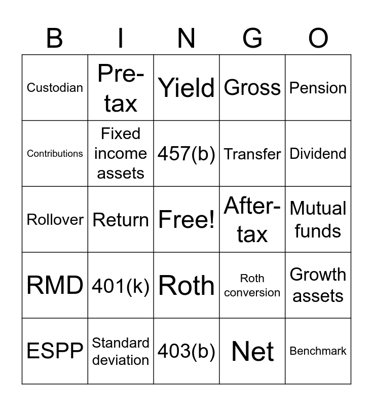 This bingo card has a free space and 25 words: 401(k), 403(b), 457(b), ESPP, Pension, Custodian, Contributions, Pre-tax, After-tax, Roth, Transfer, Rollover, Roth conversion, Growth assets, Fixed income assets, ETFs, Mutual funds, Yield, Dividend, Return, Benchmark, Standard deviation, RMD, Gross and Net.