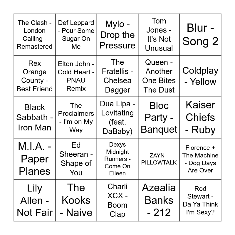 This bingo card has 58 words: Franz Ferdinand - Take Me Out, The Kooks - Naive, Foals - My Number, M.I.A. - Paper Planes, Azealia Banks - 212, Spice Girls - Stop, Elton John - Cold Heart - PNAU Remix, Oasis - Don't Look Back in Anger, Queen - Another One Bites The Dust, David Bowie - Golden Years, Tom Jones - It's Not Unusual, Gorillaz - Clint Eastwood, Robbie Williams - Rock DJ, Donna Lewis - I Love You Always Forever, Amy Winehouse - Rehab, The Clash - London Calling - Remastered, Dua Lipa - Levitating (feat. DaBaby), Blur - Song 2, Arctic Monkeys - R U Mine?, The Fratellis - Chelsea Dagger, Bloc Party - Banquet, Mylo - Drop the Pressure, Lily Allen - Not Fair, Florence + The Machine - Dog Days Are Over, Eurythmics - Sweet Dreams (Are Made of This), Kaiser Chiefs - Ruby, The Smiths - How Soon Is Now?, Edwyn Collins - A Girl Like You, Coldplay - Yellow, Duran Duran - Girls on Film, The Cure - Friday I'm In Love, Led Zeppelin - Immigrant Song, The Who - Baba O'Riley, The Beatles - Come Together, George Michael - Faith - Remastered, Harry Styles - As It Was, Adele - Rolling in the Deep, The Proclaimers - I'm on My Way, Black Sabbath - Iron Man, Melanie C - Never Be The Same Again, Ed Sheeran - Shape of You, Rod Stewart - Da Ya Think I'm Sexy?, ZAYN - PILLOWTALK, Seal - Kiss from a Rose, Yusuf / Cat Stevens - Wild World, Sade - Smooth Operator, The Police - Roxanne, Dexys Midnight Runners - Come On Eileen, Charli XCX - Boom Clap, Pink Floyd - Another Brick in the Wall, Pt. 2, Stormzy - Vossi Bop, Van Morrison - Gloria, James Blunt - Goodbye My Lover, Robert Palmer - Bad Case Of Loving You (Doctor, Doctor), Def Leppard - Pour Some Sugar On Me, Billy Ocean - Love Really Hurts Without You, Rex Orange County - Best Friend and Kim Wilde - Kids In America.