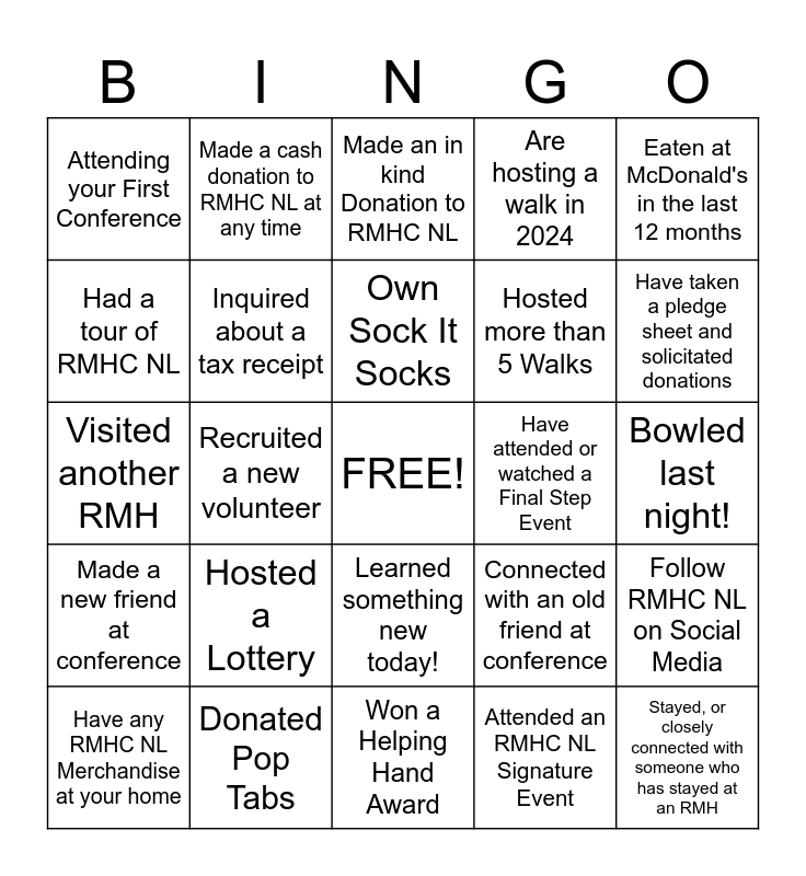 This bingo card has a free space and 24 words: Hosted a Lottery, Donated Pop Tabs, Own Sock It Socks, Have any RMHC NL Merchandise at your home, Eaten at McDonald's in the last 12 months, Attending your First Conference, Had a tour of RMHC NL, Made a cash donation to RMHC NL at any time, Have attended or watched a Final Step Event, Learned something new today!, Hosted more than 5 Walks, Visited another RMH, Connected with an old friend at conference, Follow RMHC NL on Social Media, Inquired about a tax receipt, Attended an RMHC NL Signature Event, Bowled last night!, Made an in kind Donation to RMHC NL, Have taken a pledge sheet and solicitated donations, Recruited a new volunteer, Stayed, or closely connected with someone who has stayed at an RMH, Made a new friend at conference, Are hosting a walk in 2024 and Won a Helping Hand Award.