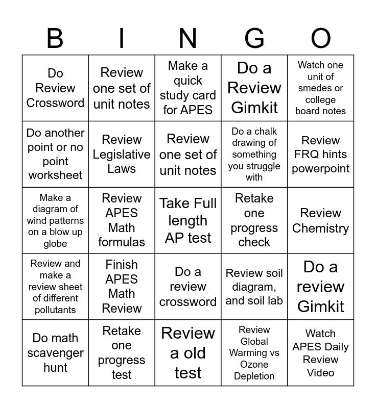 This bingo card has a free space and 24 words: Finish APES Math Review, Retake one progress test, Review one set of unit notes, Do math scavenger hunt, Watch one unit of smedes or college board notes, Do Review Crossword, Do another point or no point worksheet, Review one set of unit notes, Retake one progress check, Do a review crossword, Do a chalk drawing of something you struggle with, Make a diagram of wind patterns on a blow up globe, Review soil diagram, and soil lab, Do a review Gimkit, Review Legislative Laws, Review Global Warming vs Ozone Depletion, Review Chemistry, Make a quick study card for APES, Review FRQ hints powerpoint, Review APES Math formulas, Watch APES Daily Review Video, Review and make a review sheet of different pollutants, Do a Review Gimkit and Review a old test.