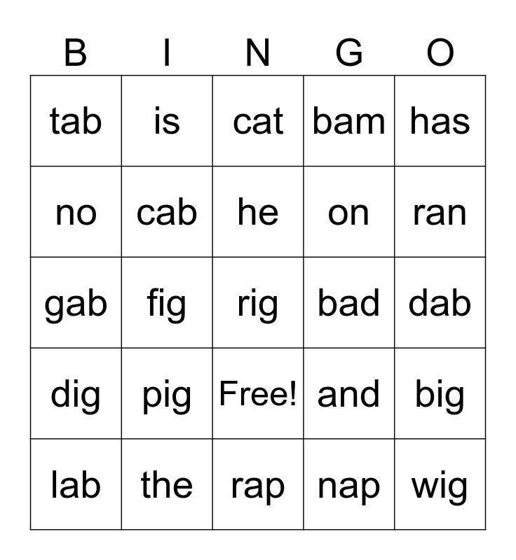 This bingo card has 26 words: Free!, nap, he, the, has, tab, no, is, dab, and, on, gab, big, lab, fig, jab, bam, dig, cat, rig, ran, rap, bad, pig, cab and wig.