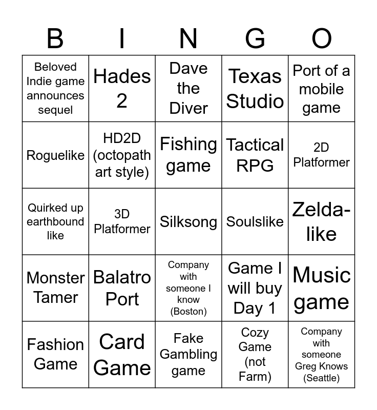 This bingo card has 25 words: Balatro Port, Fake Gambling game, Fishing game, Fashion Game, Port of a mobile game, Beloved Indie game announces sequel, Roguelike, Hades 2, Soulslike, Company with someone I know (Boston), Tactical RPG, Quirked up earthbound like, Game I will buy Day 1, Music game, HD2D (octopath art style), Company with someone Greg Knows (Seattle), Zelda-like, Dave the Diver, 2D Platformer, 3D Platformer, Silksong, Card Game, Monster Tamer, Texas Studio and Cozy Game (not Farm).
