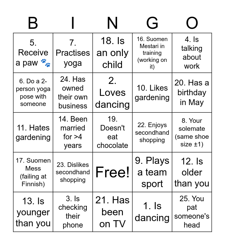 This bingo card has 26 words: Free!, 1. Is dancing, 2. Loves dancing, 3. Is checking their phone, 4. Is talking about work, 5. Receive a paw 🐾, 6. Do a 2-person yoga pose with someone, 7. Practises yoga, 8. Your solemate (same shoe size ±1), 9. Plays a team sport, 10. Likes gardening, 11. Hates gardening, 12. Is older than you, 13. Is younger than you, 14. Been married for >4 years, 15. Suomen Mestari (passed YKI test), 16. Suomen Mestari in training (working on it), 17. Suomen Mess (failing at Finnish), 18. Is an only child, 19. Doesn't eat chocolate, 20. Has a birthday in May, 21. Has been on TV, 22. Enjoys secondhand shopping, 23. Dislikes secondhand shopping, 24. Has owned their own business and 25. You pat someone's head.