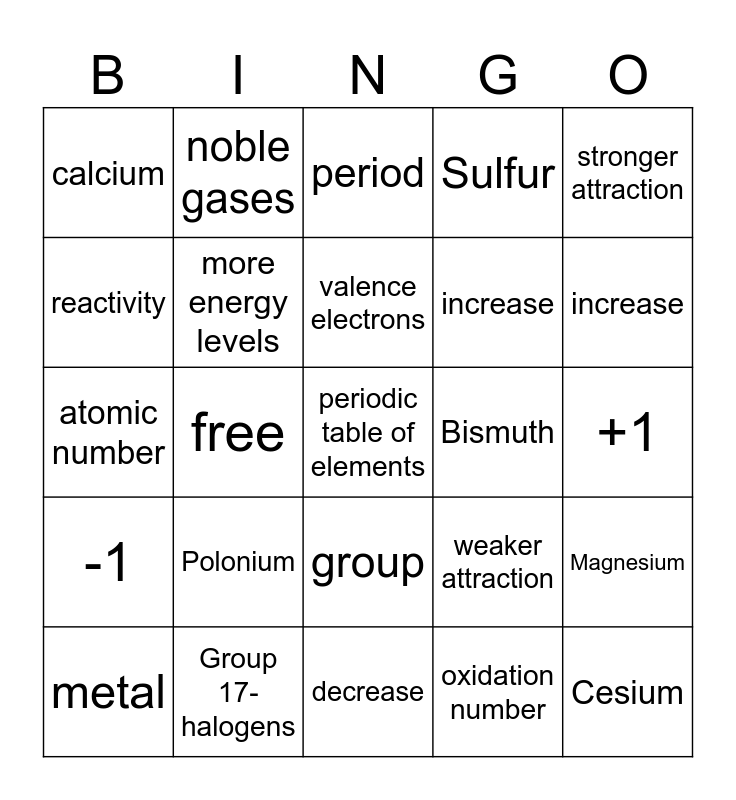 This bingo card has a free space and 24 words: Polonium, Group 17- halogens, valence electrons, metal, stronger attraction, calcium, reactivity, noble gases, Bismuth, group, increase, atomic number, weaker attraction, Magnesium, more energy levels, oxidation number, +1, period, increase, free, Cesium, -1, Sulfur and decrease.