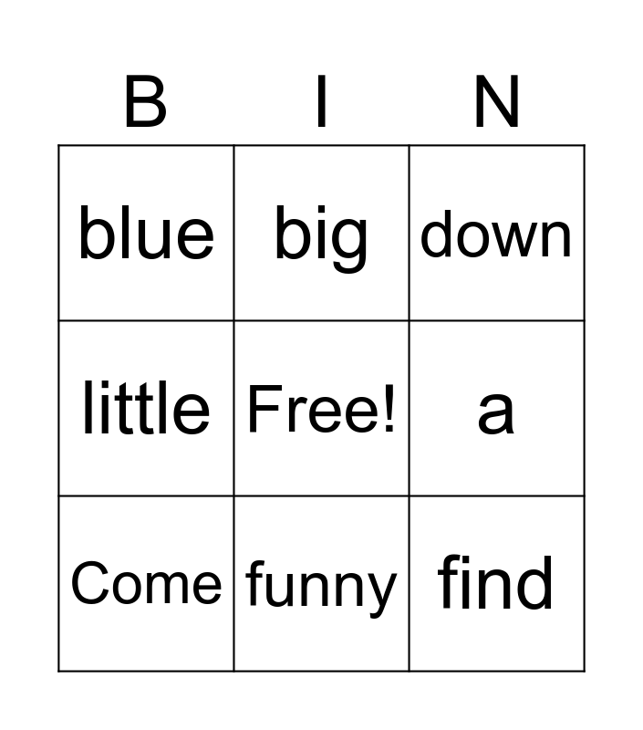 This bingo card has a free space and 8 words: a, down, big, Come, blue, find, little and funny.