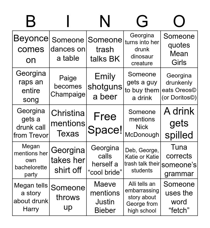 This bingo card has a free space and 24 words: Georgina takes her shirt off, Someone throws up, Emily shotguns a beer, Megan tells a story about drunk Harry, Someone quotes Mean Girls, Beyonce comes on, Georgina raps an entire song, Someone dances on a table, Someone mentions Nick McDonough, Georgina calls herself a “cool bride”, Someone gets a guy to buy them a drink, Georgina gets a drunk call from Trevor, Deb, George, Katie or Katie trash talk their students, Tuna corrects someone’s grammar, Paige becomes Champaige, Alli tells an embarrassing story about George from high school, A drink gets spilled, Someone trash talks BK, Georgina drunkenly eats Oreos© (or Doritos©), Christina mentions Texas, Someone uses the word “fetch”, Megan mentions her own bachelorette party, Georgina turns into her drunk dinosaur creature and Maeve mentions Justin Bieber.