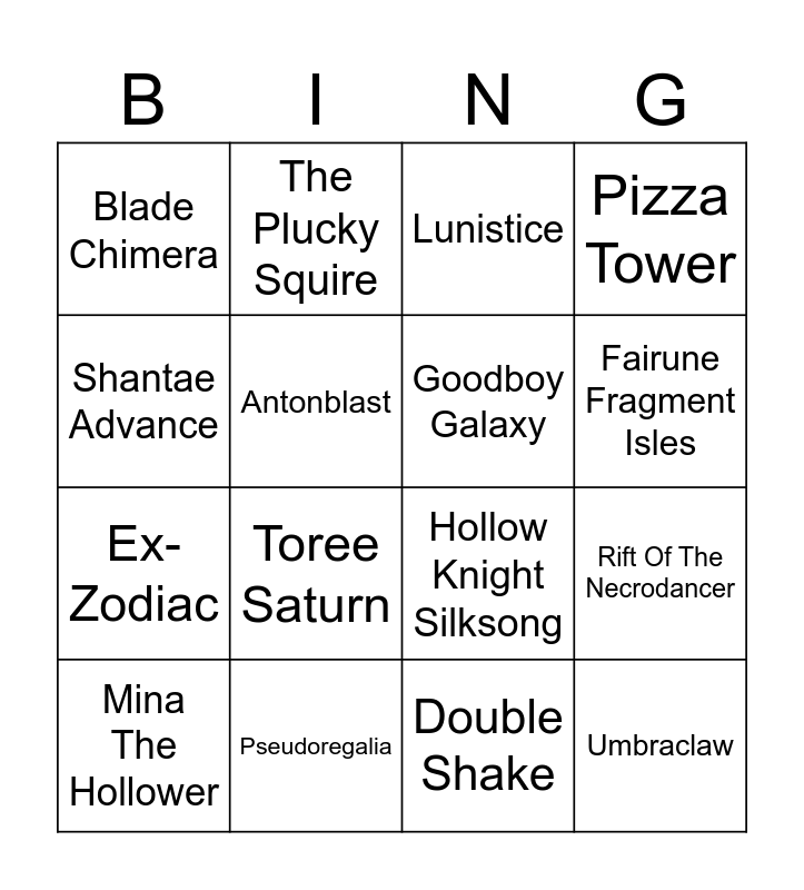 This bingo card has 16 words: Pseudoregalia, Rift Of The Necrodancer, Lunistice, Blade Chimera, Ex-Zodiac, The Plucky Squire, Hollow Knight Silksong, Double Shake, Shantae Advance, Antonblast, Mina The Hollower, Pizza Tower, Toree Saturn, Fairune Fragment Isles, Goodboy Galaxy and Umbraclaw.