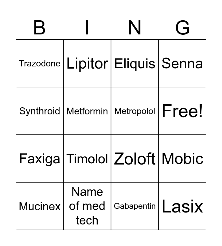 This bingo card has 18 words: Timolol, Lasix, Eliquis, Trazodone, Zoloft, Senna, Mucinex, Lipitor, Free!, Faxiga, Gabapentin, Synthroid, Mobic, Metformin, Metropolol, Risperidine, Name of med tech and Acetominpahin.