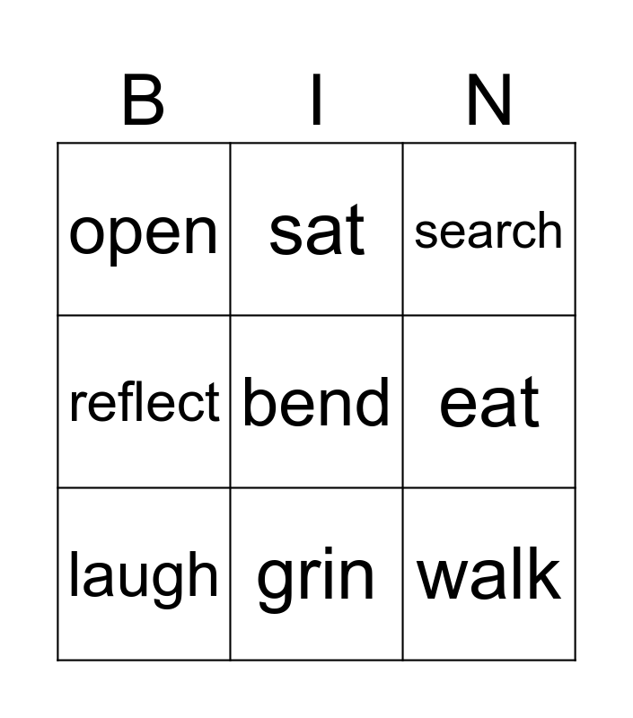 This bingo card has a free space and 20 words: ran, jump, search, hum, love, walk, yawn, open, hum, sat, lick, think, eat, despair, laugh, hurry, grin, reflect, plan and skip.
