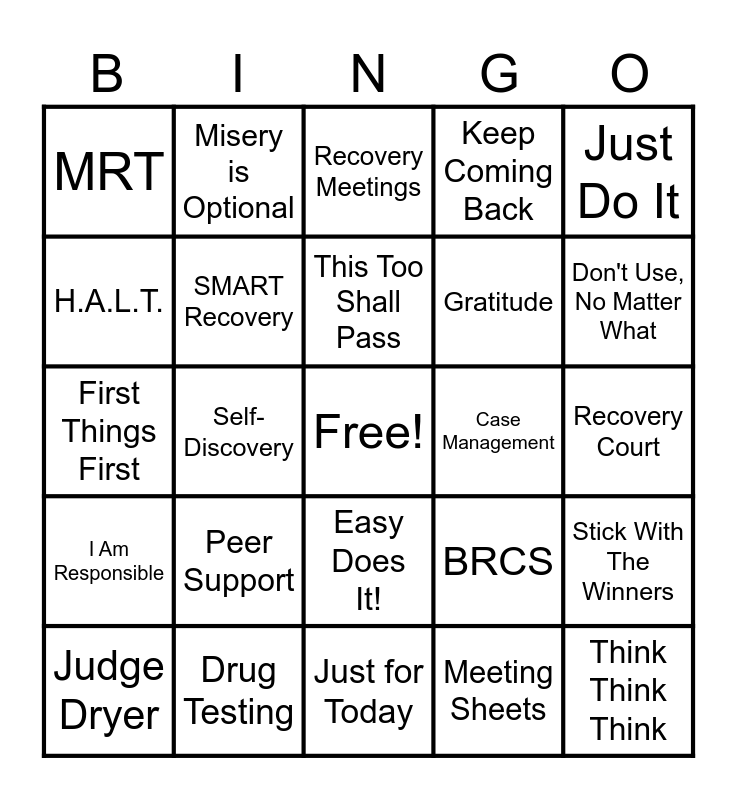 This bingo card has a free space and 29 words: Judge Dryer, IOP, Self-Discovery, Coping Skills, MRT, Recovery Meetings, SMART Recovery, Peer Support, Case Management, Drug Testing, Recovery Court, Think Think Think, Just for Today, Meeting Sheets, Don't Use, No Matter What, Suit Up & Show Up!, Easy Does It!, I Am Responsible, Just Do It, First Things First, BRCS, VCSB, Gratitude, H.A.L.T., Keep Coming Back, Misery is Optional, Stick With The Winners, This Too Shall Pass and Litter Control Program.