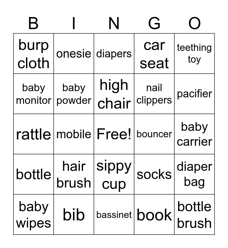 This bingo card has a free space and 30 words: bib, towel, mobile, baby spoon, burp cloth, diapers, baby powder, sippy cup, bouncer, bassinet, baby carrier, bottle brush, book, diaper cream, pacifier, changing mat, socks, bottle, hair brush, teething toy, rattle, blanket, onesie, nail clippers, baby monitor, car seat, diaper bag, baby wipes, high chair and stroller bathtub.