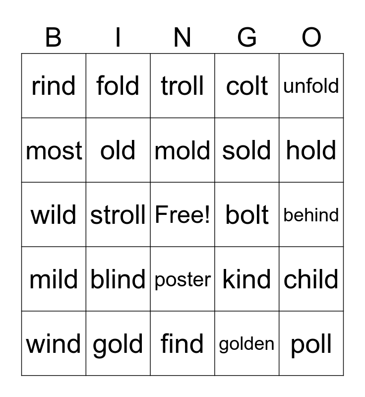 This bingo card has a free space and 27 words: kind, ghost, sold, find, most, troll, fold, mild, bolt, child, wild, colt, wind, gold, hold, host, old, mold, blind, rind, behind, golden, stroll, poll, poster, unfold and folding.