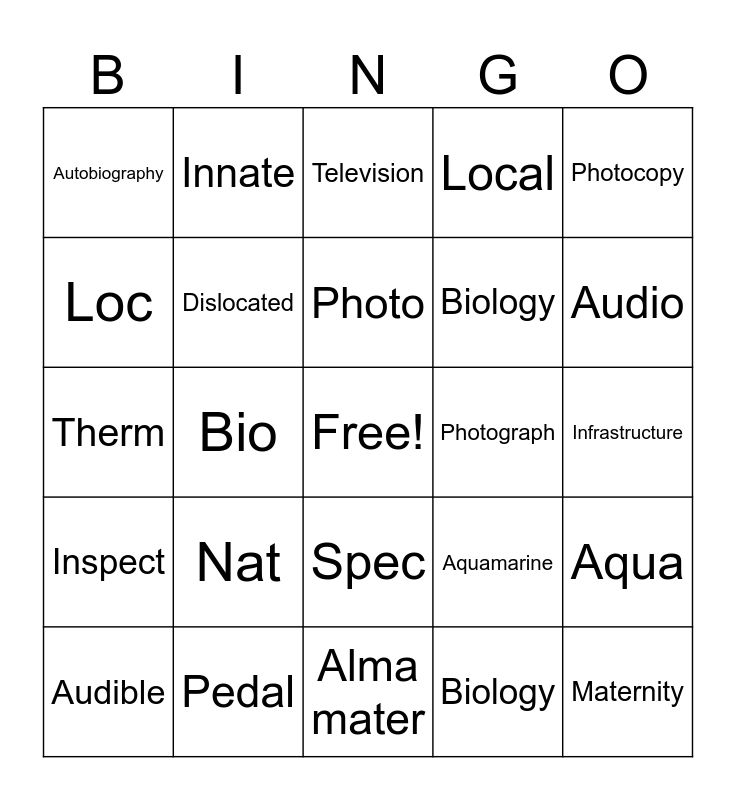 This bingo card has a free space and 48 words: Mater, Maternity, Maternal, Alma mater, Nat, Native, Innate, Nation, Loc, Location, Dislocated, Local, Aqua, Aquamarine, Aquarius, Aquarium, Photo, Photograph, Photosynthesis, Photocopy, Bio, Biology, Autobiography, Biology, Aud, Audio, Audible, Audience, Spec, Inspect, Spectacle, Spectator, Ped, Pedestrian, Pedal, Biped, Struct, Infrastructure, Construction, Recognizable, Vis, Invisible, Television, Vision, Therm, Thermos, Thermostat and Thermometer.