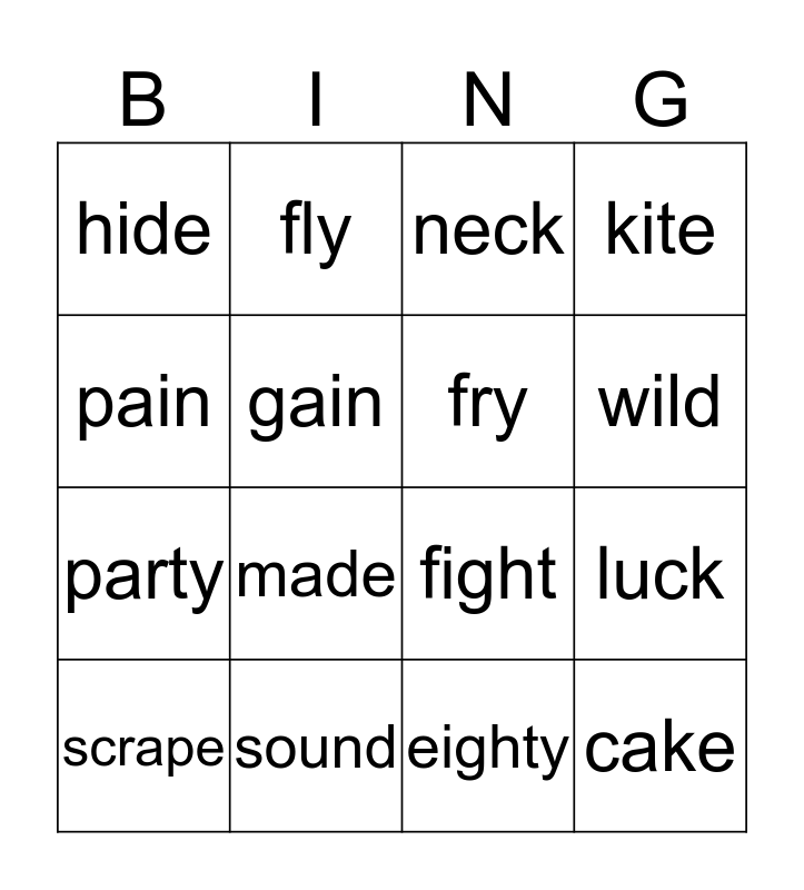 This bingo card has 16 words: sound, luck, neck, hide, party, fly, fight, eighty, pain, gain, scrape, kite, made, wild, fry and cake.