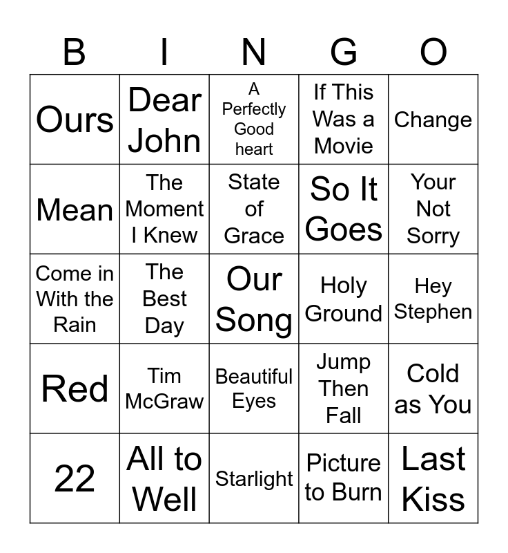 This bingo card has 42 words: Free!, State of Grace, Hits Different, Tim McGraw, Picture to Burn, Cold as You, Our Song, Invisible, A Perfectly Good heart, Beautiful Eyes, Hey Stephen, Your Not Sorry, The Best Day, Change, Forever and Always, Jump Then Fall, Untouchable, Come in With the Rain, Superstar, Dear John, Mean, Story of Us, Last Kiss, Ours, Getaway Car, Gorgeous, So It Goes, Look What You Made me Do, Ready for It?, New Romantics, I Wish You Would, Red, The Moment I Knew, Starlight, The Lucky One, 22, All to Well, Holy Ground, Begin Again, Mine, If This Was a Movie and Haunted.