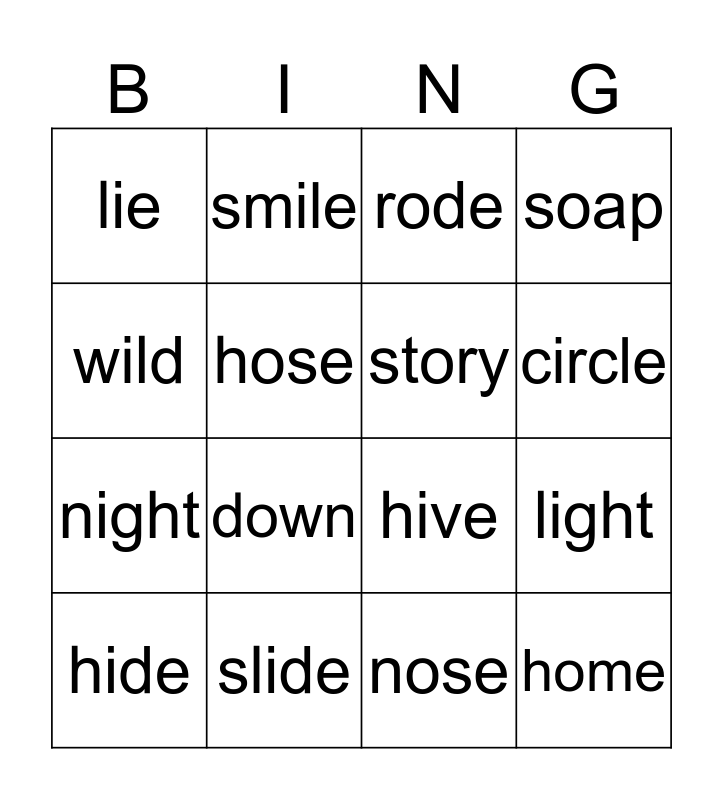 This bingo card has a free space and 15 words: hide, home, rode, lie, circle, wild, down, nose, hose, night, light, soap, story, smile and slide.