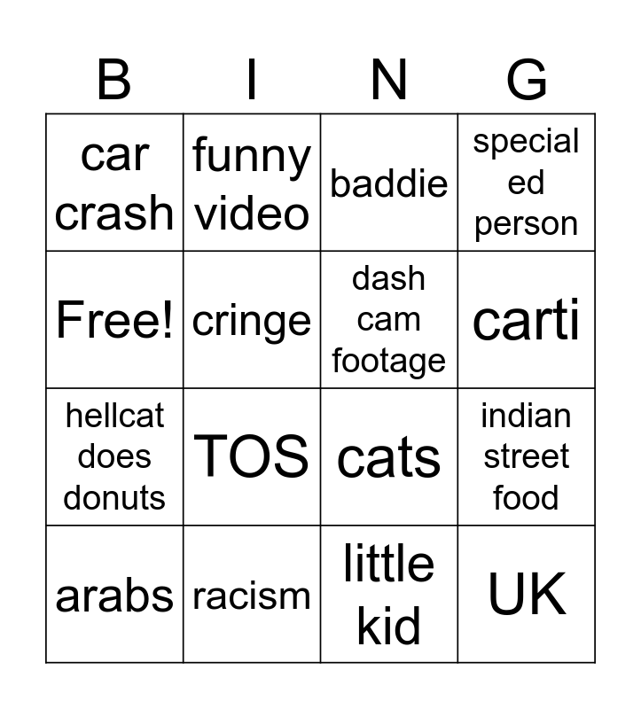 This bingo card has 16 words: racism, indian street food, baddie, car crash, hellcat does donuts, funny video, cats, little kid, Free!, cringe, arabs, special ed person, TOS, carti, dash cam footage and UK.