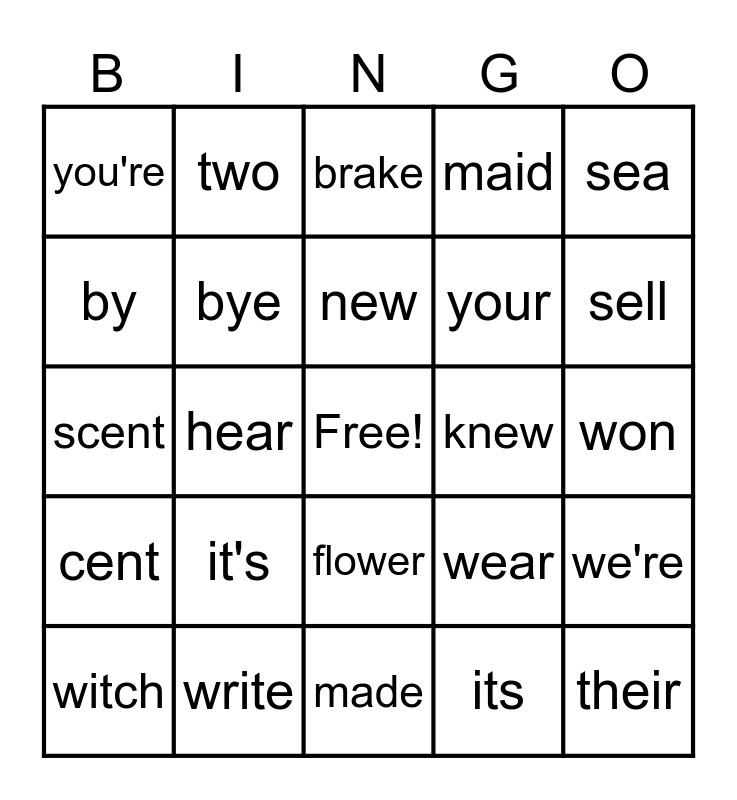 This bingo card has a free space and 53 words: there, their, they're, its, it's, to, two, too, by, buy, bye, where, we're, wear, which, witch, new, knew, see, sea, hear, here, your, you're, right, write, whether, weather, cell, sell, son, sun, ate, eight, for, four, maid, made, brake, break, waste, waist, won, one, flour, flower, meet, meat, scent, cent, sent, aloud and allowed.