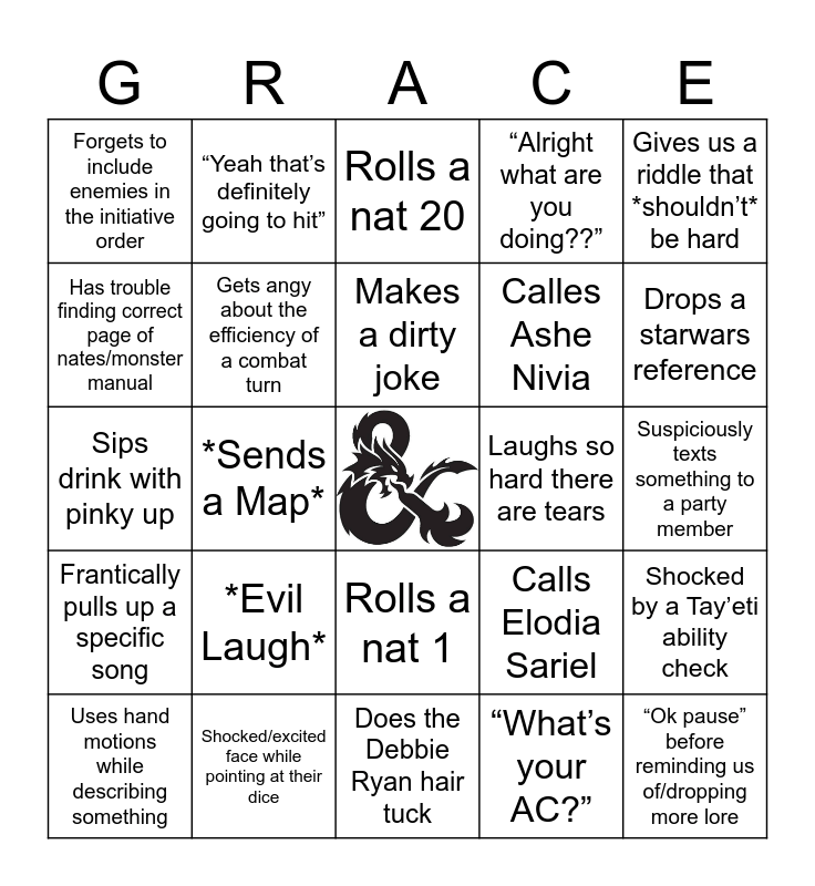 This bingo card has a free space and 37 words: *Chokes on Dr. Pepper*, Tells us to focus while role playing, “I’ve gotta grab my dice”, Gets angy about the efficiency of a combat turn, Shocked by a Tay’eti ability check, *Evil Laugh*, Makes a dirty joke, Nose scrunch/head shake to tell us not to do something, Gives us a riddle that *shouldn’t* be hard, “We’re gonna move on”, *Sends a Map*, “Alright what are you doing??”, “Ok pause” before reminding us of/dropping more lore, Suspiciously texts something to a party member, Has trouble finding correct page of nates/monster manual, Frantically pulls up a specific song, Forgets how to do an NPC voice, Rolls a nat 20, Rolls a nat 1, Laughs so hard there are tears, Forgets to include enemies in the initiative order, Drops a starwars reference, Uses hand motions while describing something, Does the Debbie Ryan hair tuck, Shocked face while pointing at dice, “What’s your AC?”, “Yeah that’s definitely going to hit”, Asks us to preplan our turns, Says “sure” when they really mean “I don’t think I agree but also I don’t want to argue”, Says no to something we want to do, Rolls dice randomly without telling us why, Shocked/excited face while pointing at their dice, Sips drink with pinky up, Sighs deeply at our confusion, Calls Elodia Sariel, Calles Ashe Nivia and Little scream as something falls.